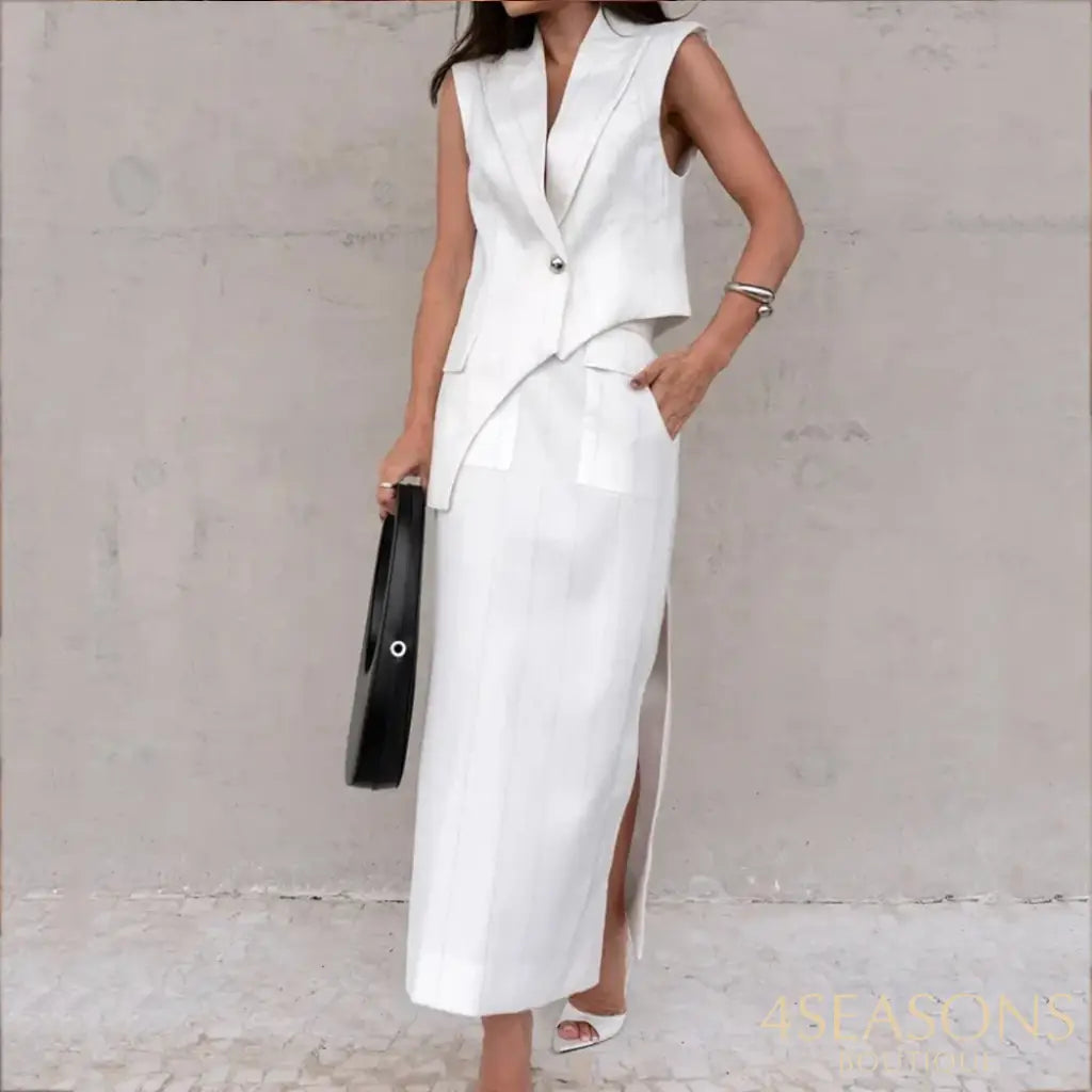 Decoration: Sleeveless blazer with an asymmetrical hem, midi skirt with a subtle side slit and pockets