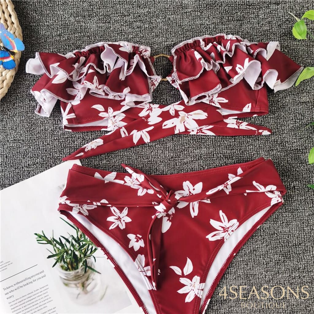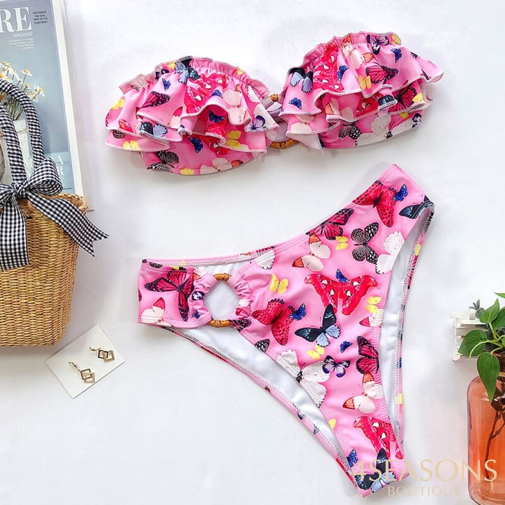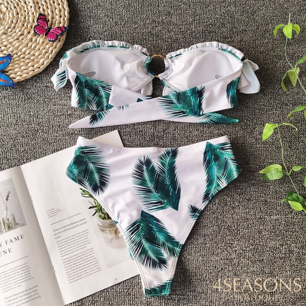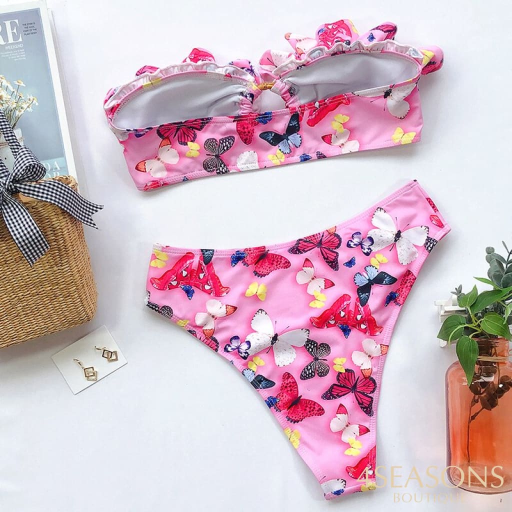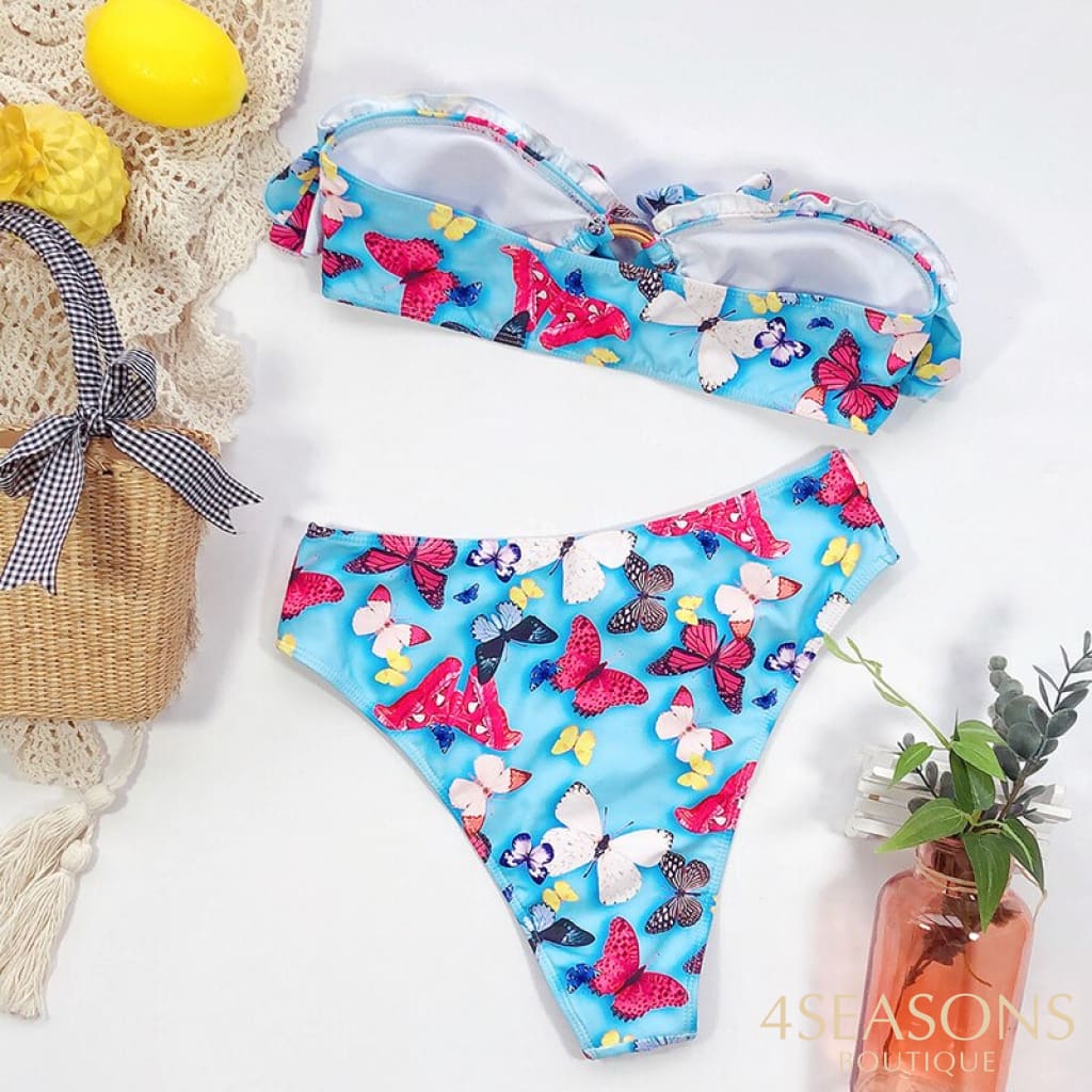 Biquíni de cintura alta, com top babado, disponível em quatro cores diferentes.