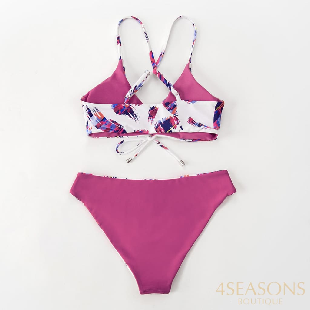 Conjunto reversível estampado, disponível em varias estampas. Alças e top ajustáveis. Possui bojo.