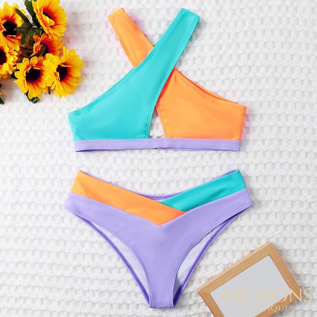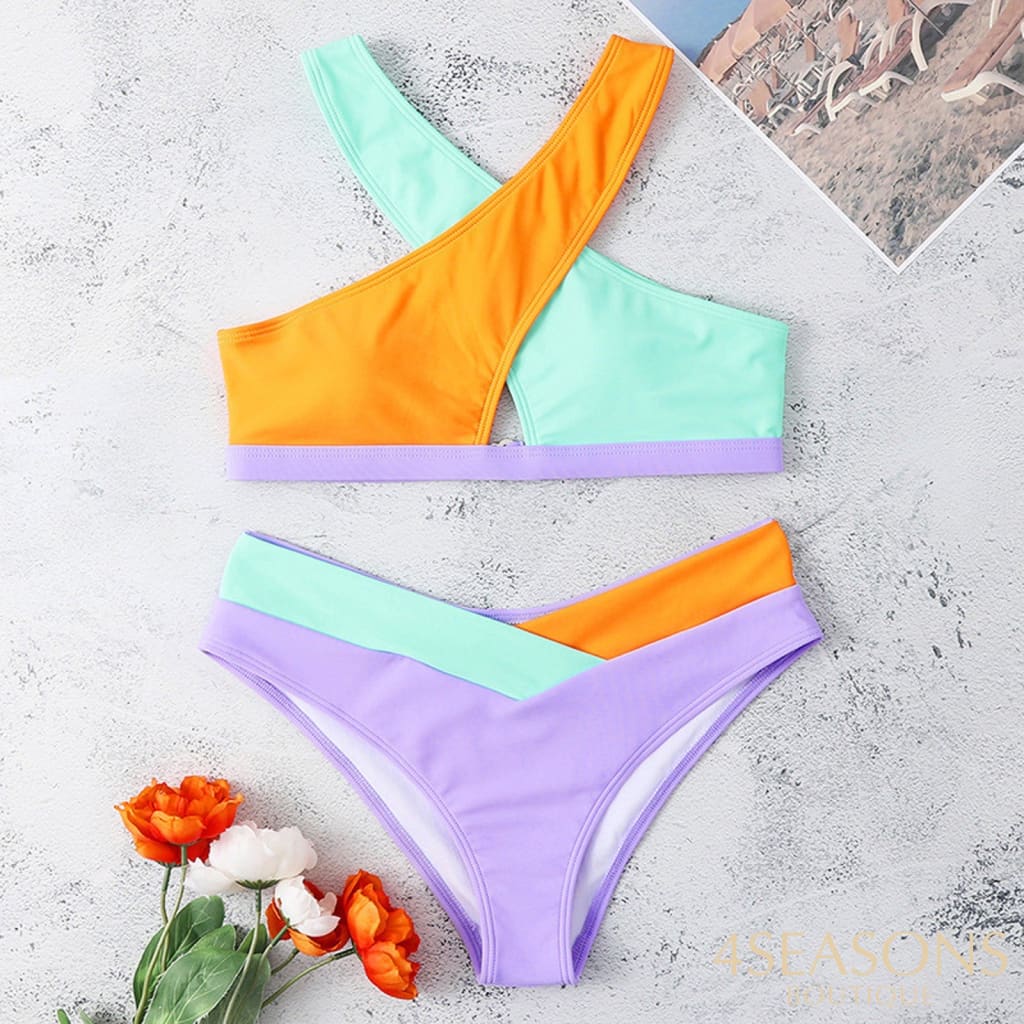 Conjunto estilo arco-íris, disponível em diversas cores. Confeccionado com poliéster para maior conforto. Não possui bojo.