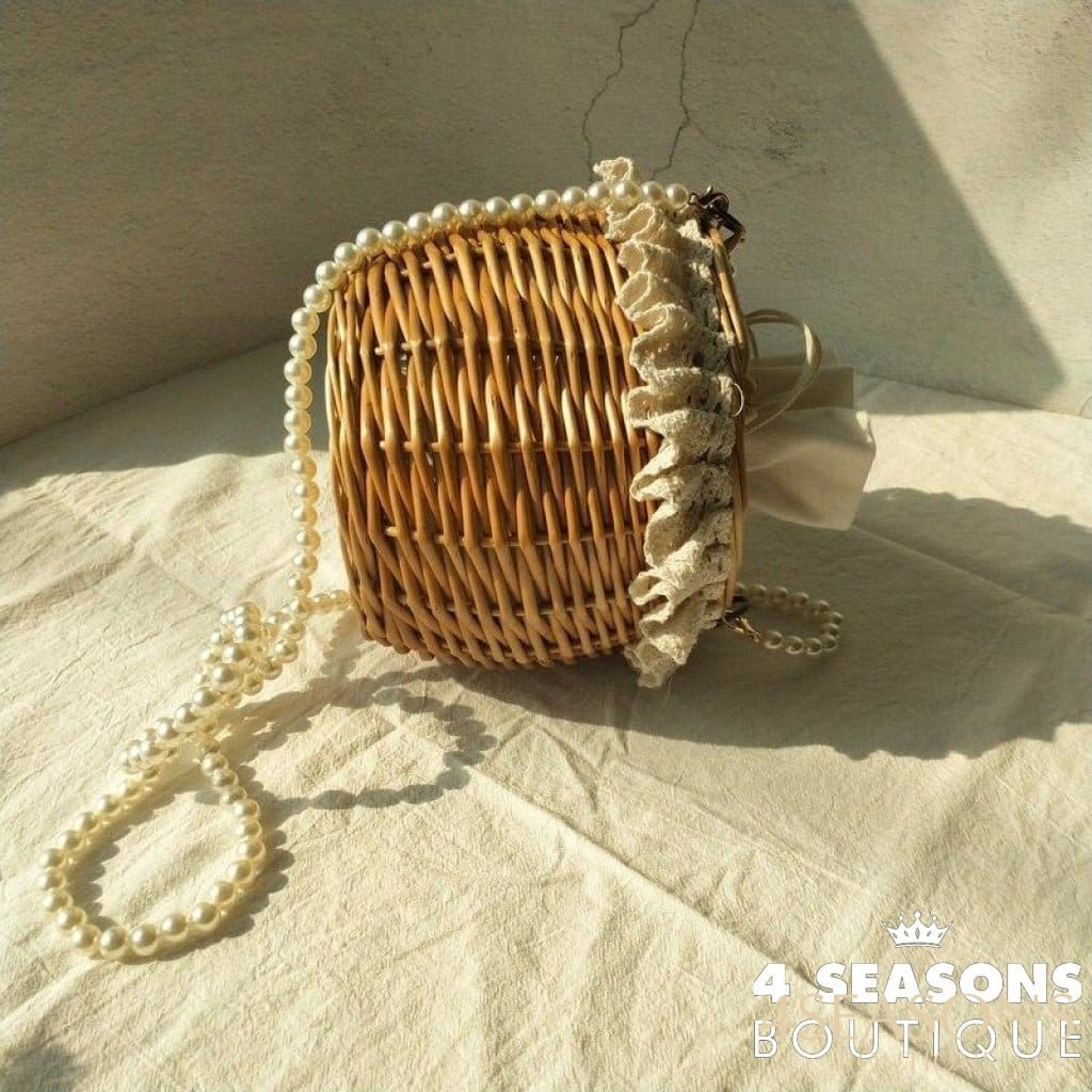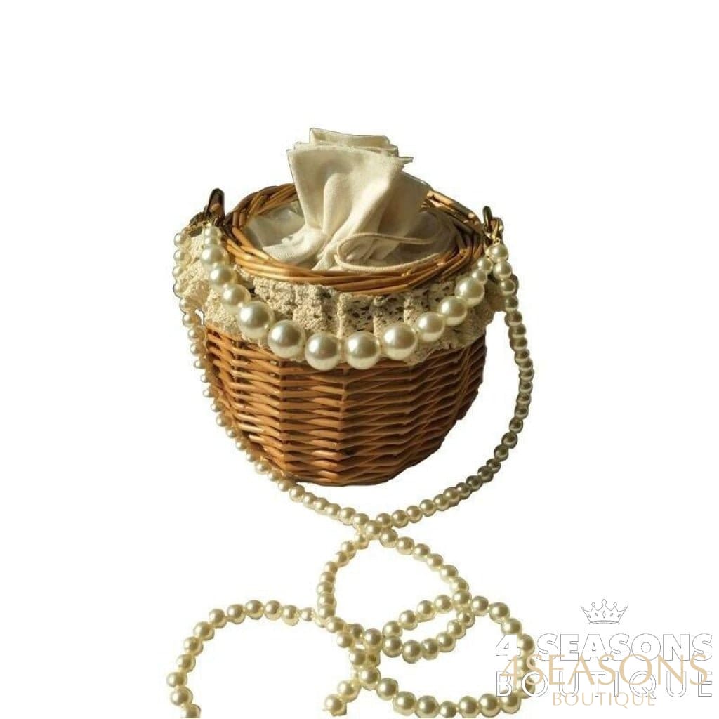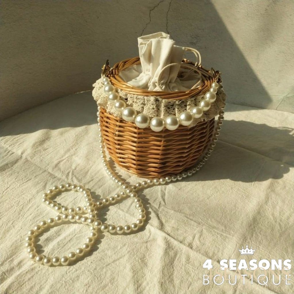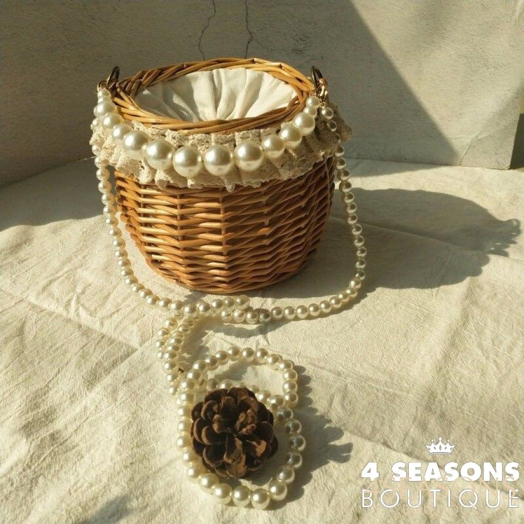 Bolsa de palha trançada com forro e pérolas (alça lateral e alça de mão);