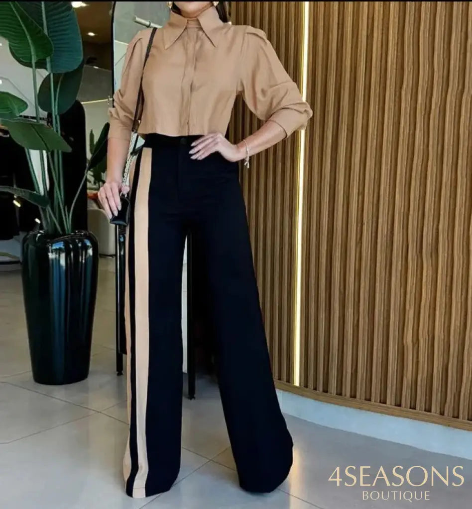 Comprimento: Calça Pantalona com bolsos e listras estratégicas