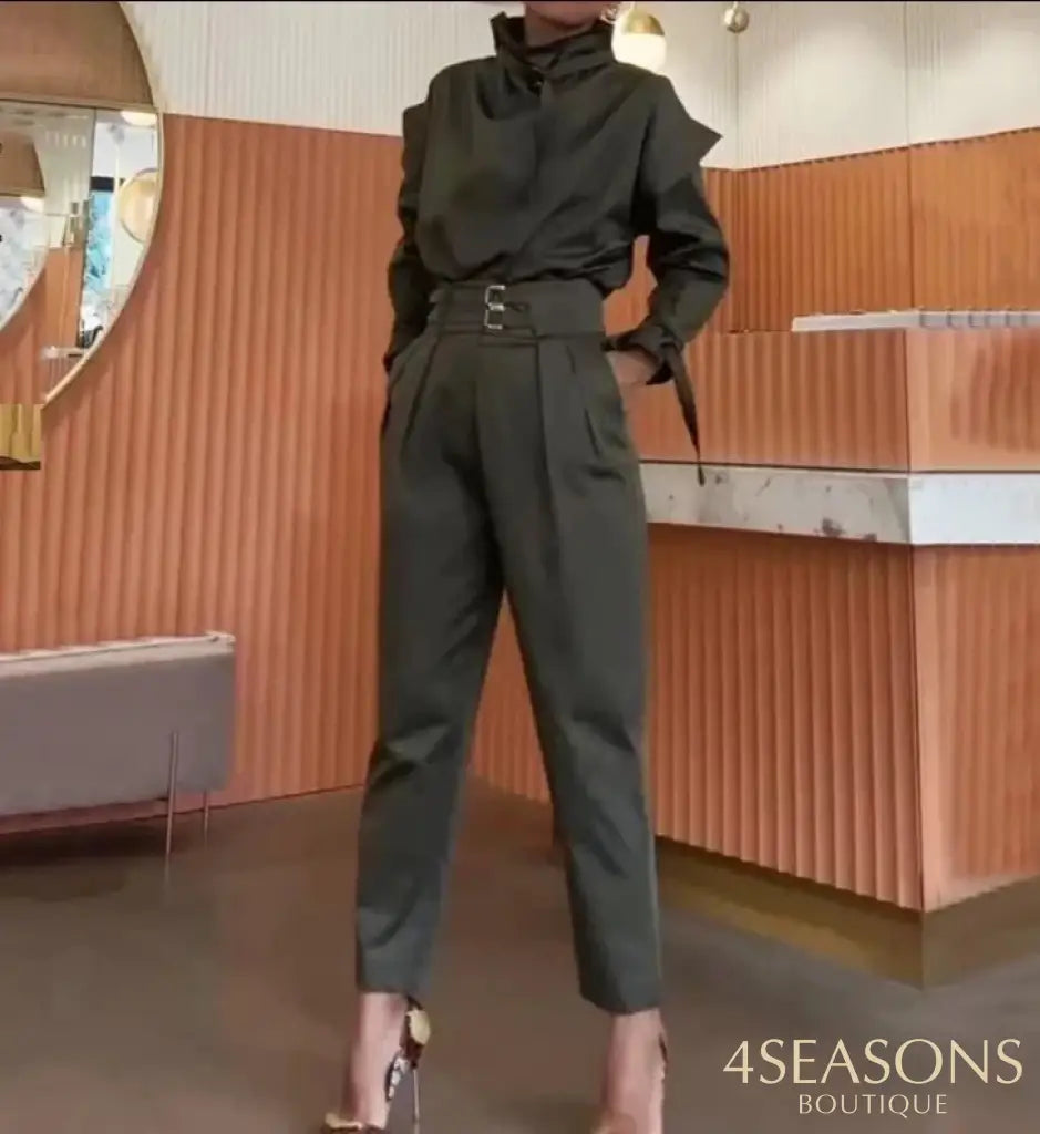 - Blusa: elegante com frisos e manga comprida podendo ser ajustada no pulso e pescoço