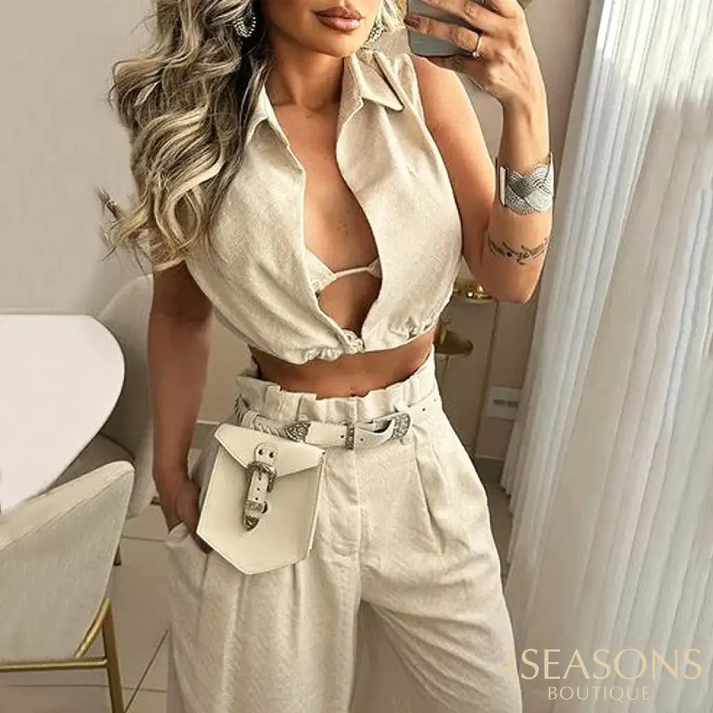 - Calça : Pantalona e detalhe exclusivo no cós, friso no comprimento (não acompanha o cinto)