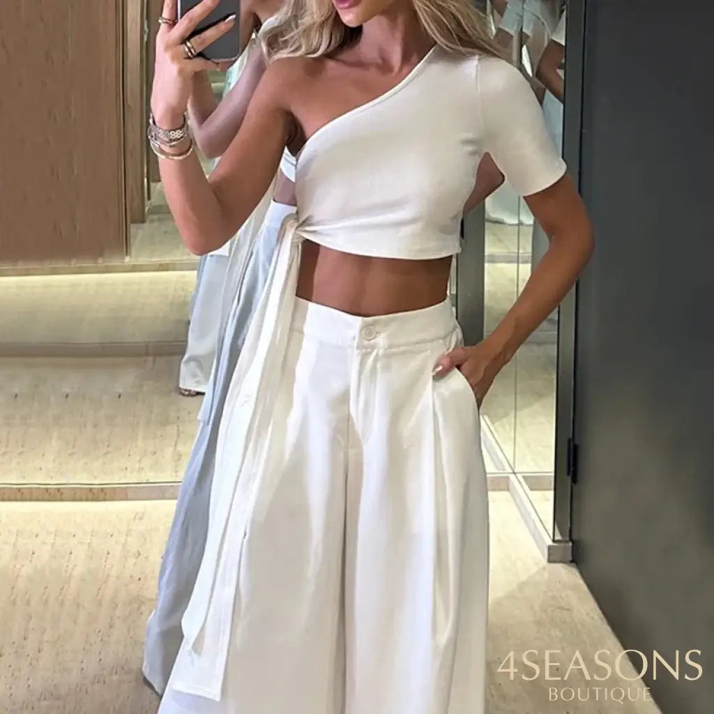 - Busto : Decote inclinado com amarração