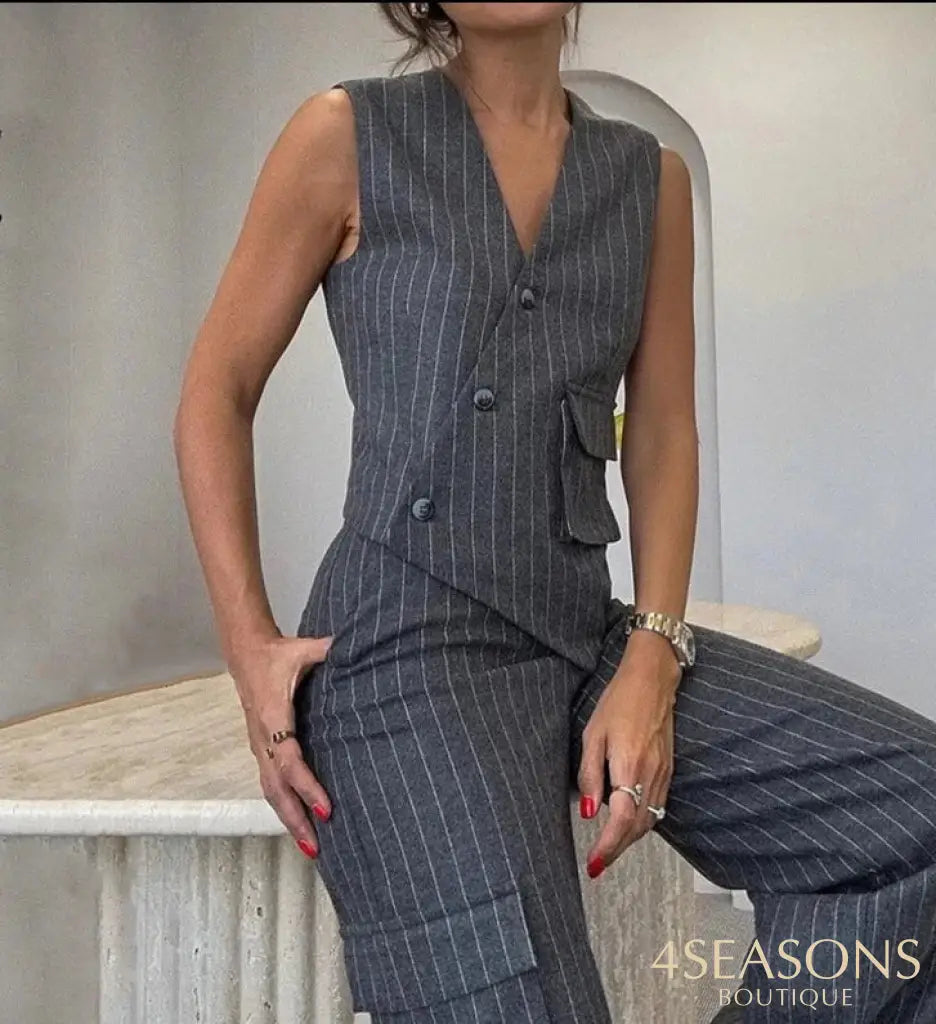 - COLETINHO GOLA V COM BARRA ASSIMÉTRICA, PRESENÇA DE BOLSO E BOTÕES
