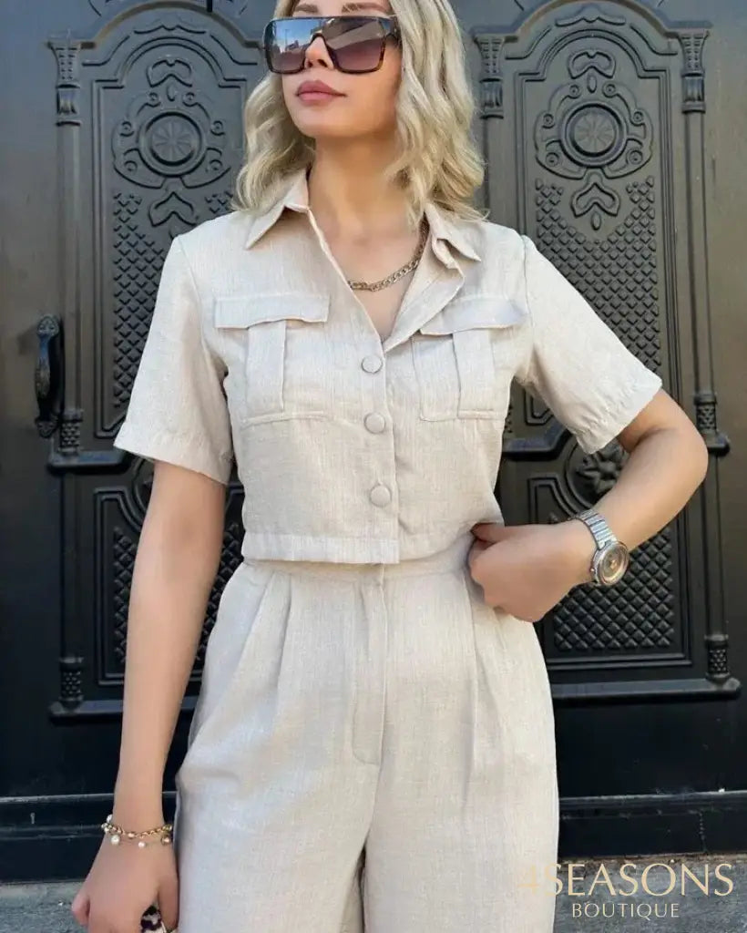 - CALÇA CINTURA ALTA E COLETINHO COM BOTÕES ENCAPADOS E GOLA POLO