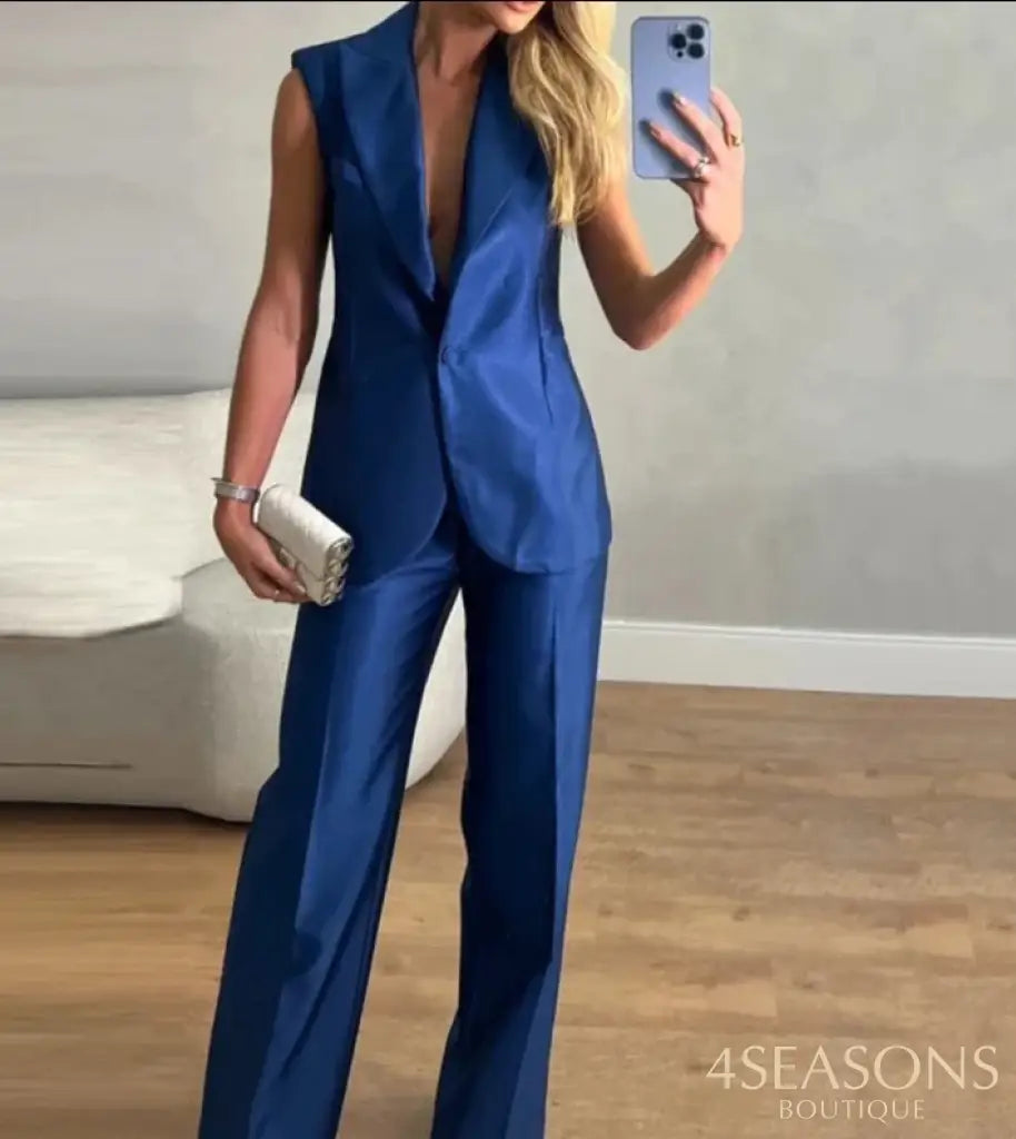 - CALÇA PANTALONA E CAMISA GOLA POLO, DECOTE EM V COM DETALHES DE BOTÃO E CORTE NOBRE NAS COSTAS