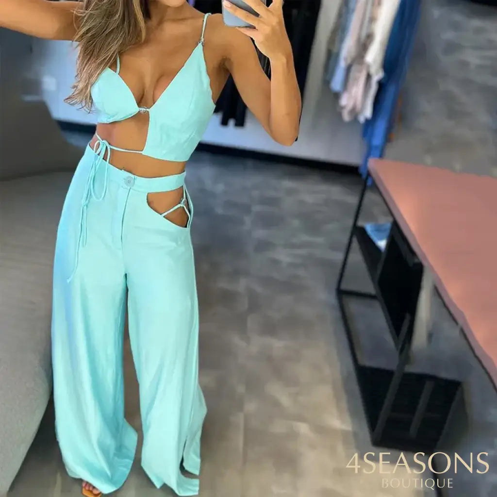 - Detalhe : Calça pantalona com bolsos e detalhe no cós, cropped com botões de fechamento nas costas, gola V e alça regulável