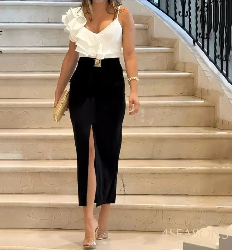 Detalhe : Saia midi com fenda e cinto fivela incluso