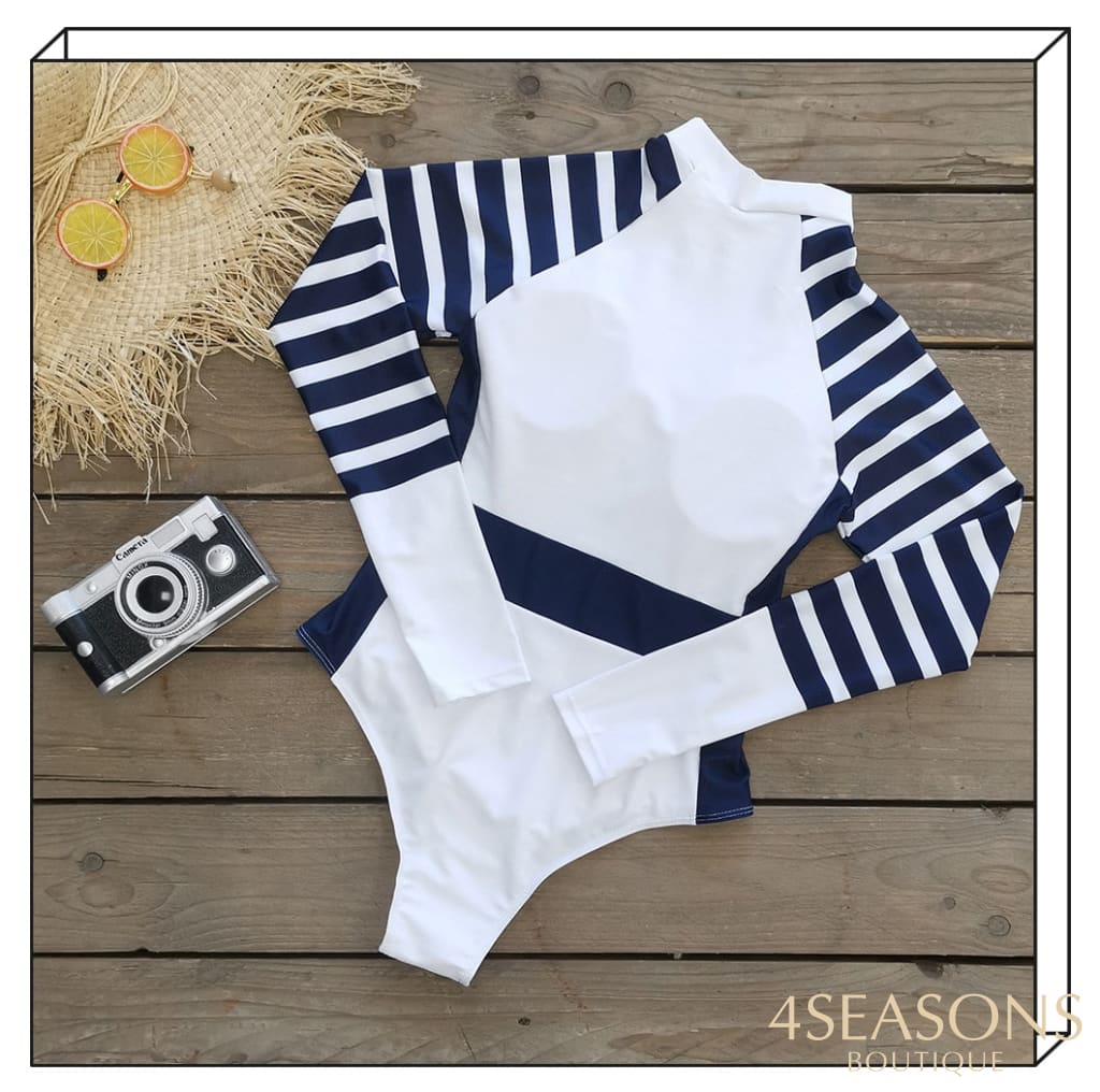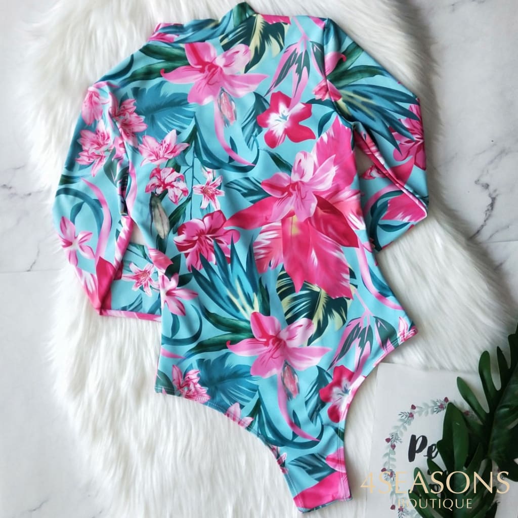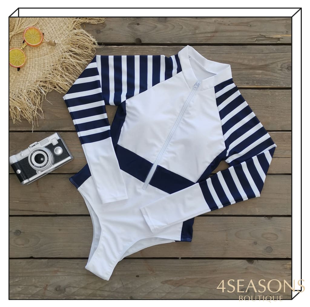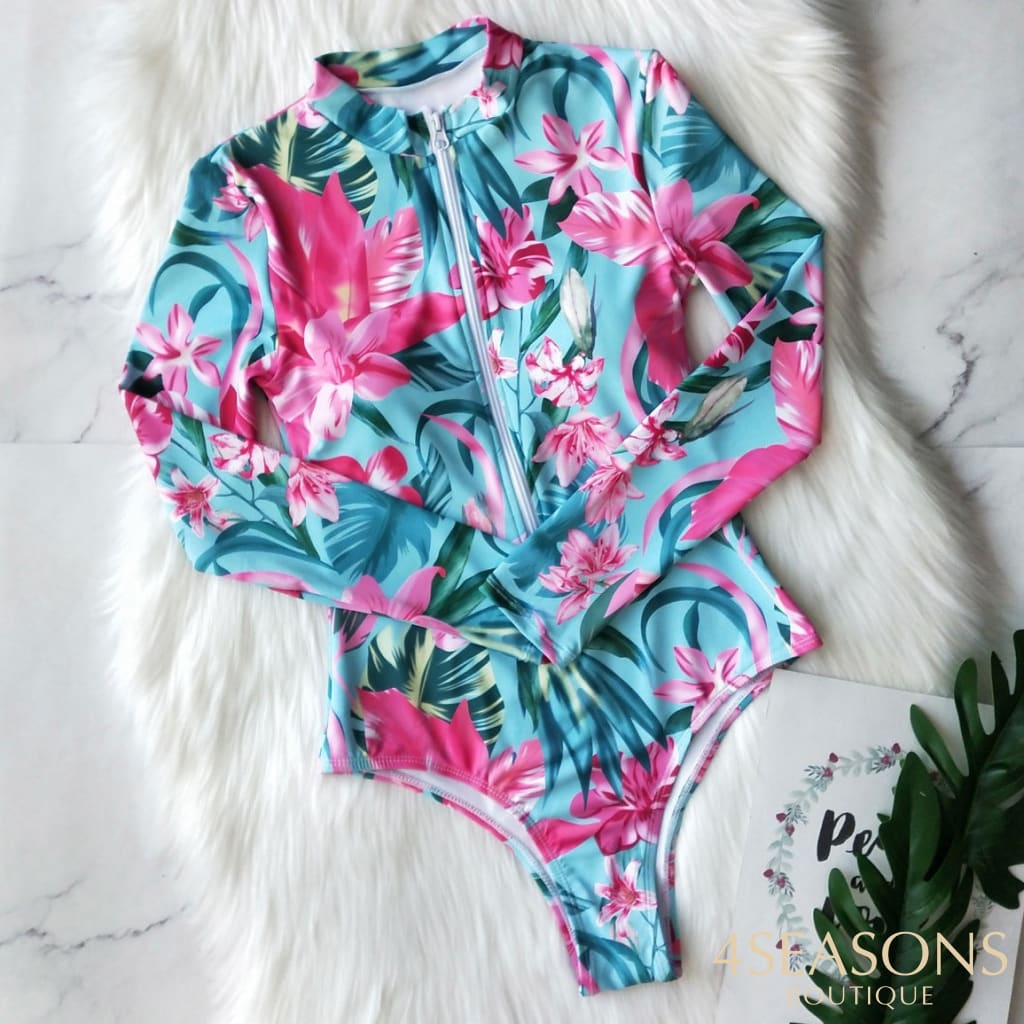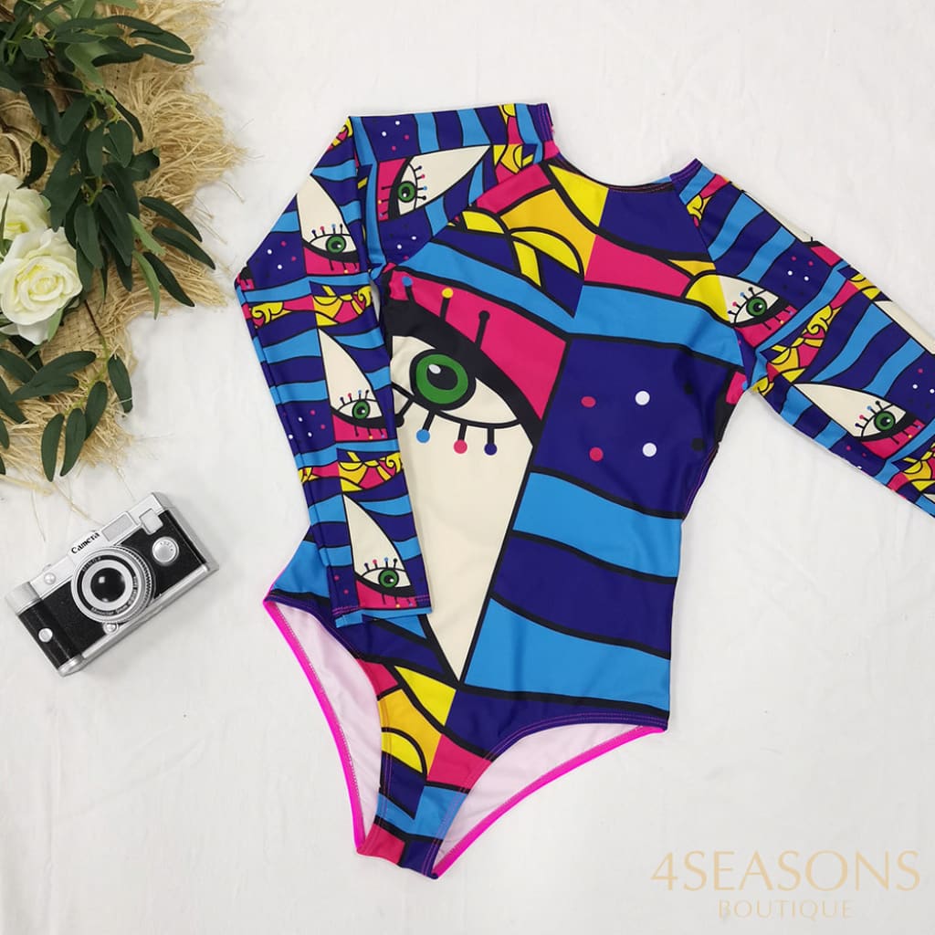 Maiô manga longa, em várias estampas com gola frontal, zíper e/ou amarração. Possui bojo removível. Calcinha tamanho tradicional.