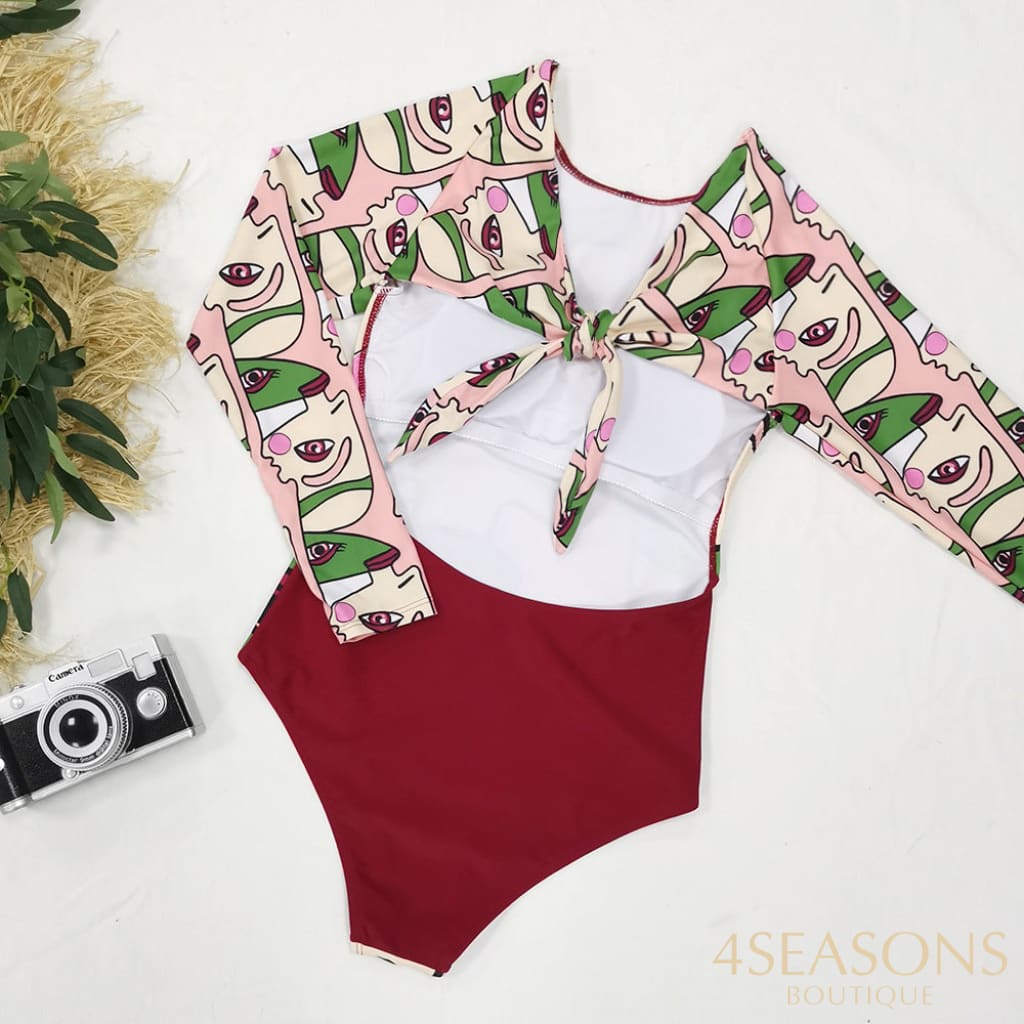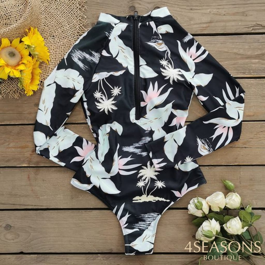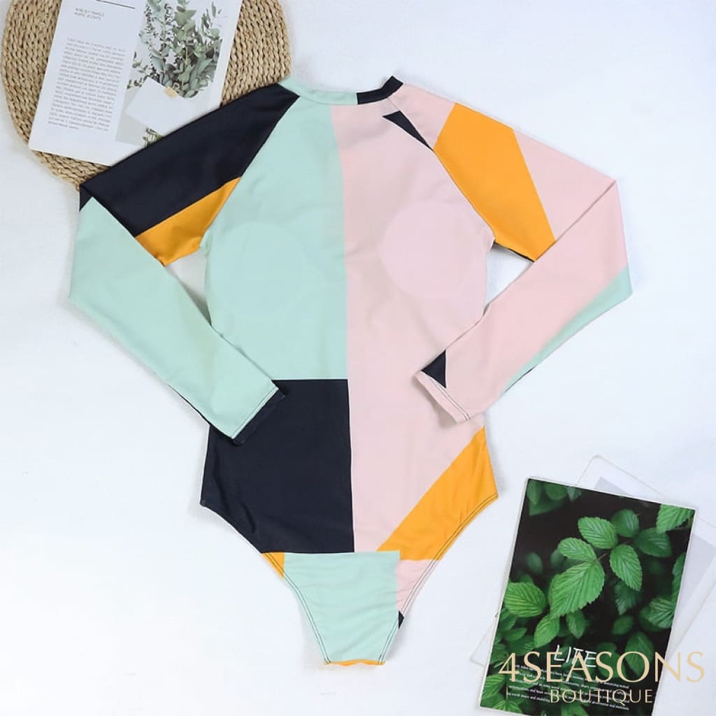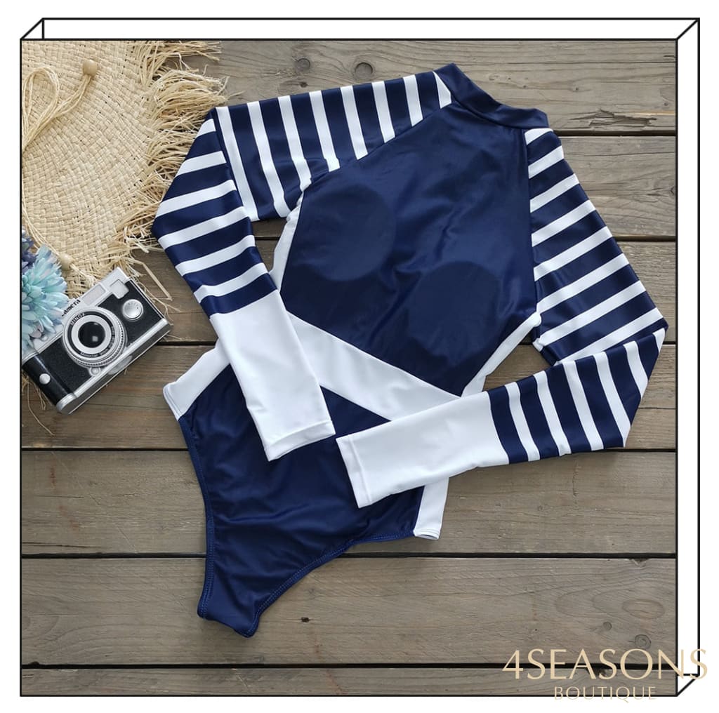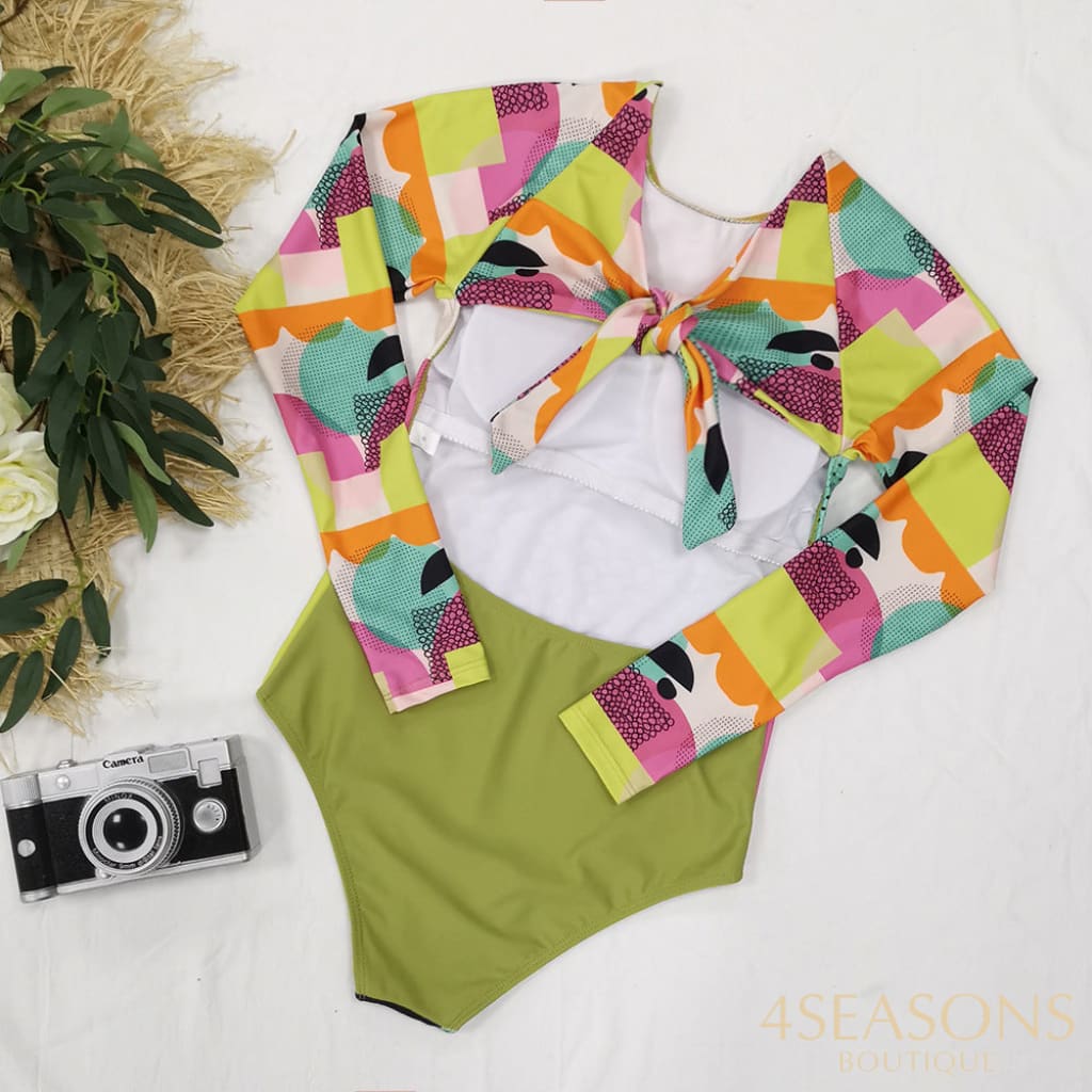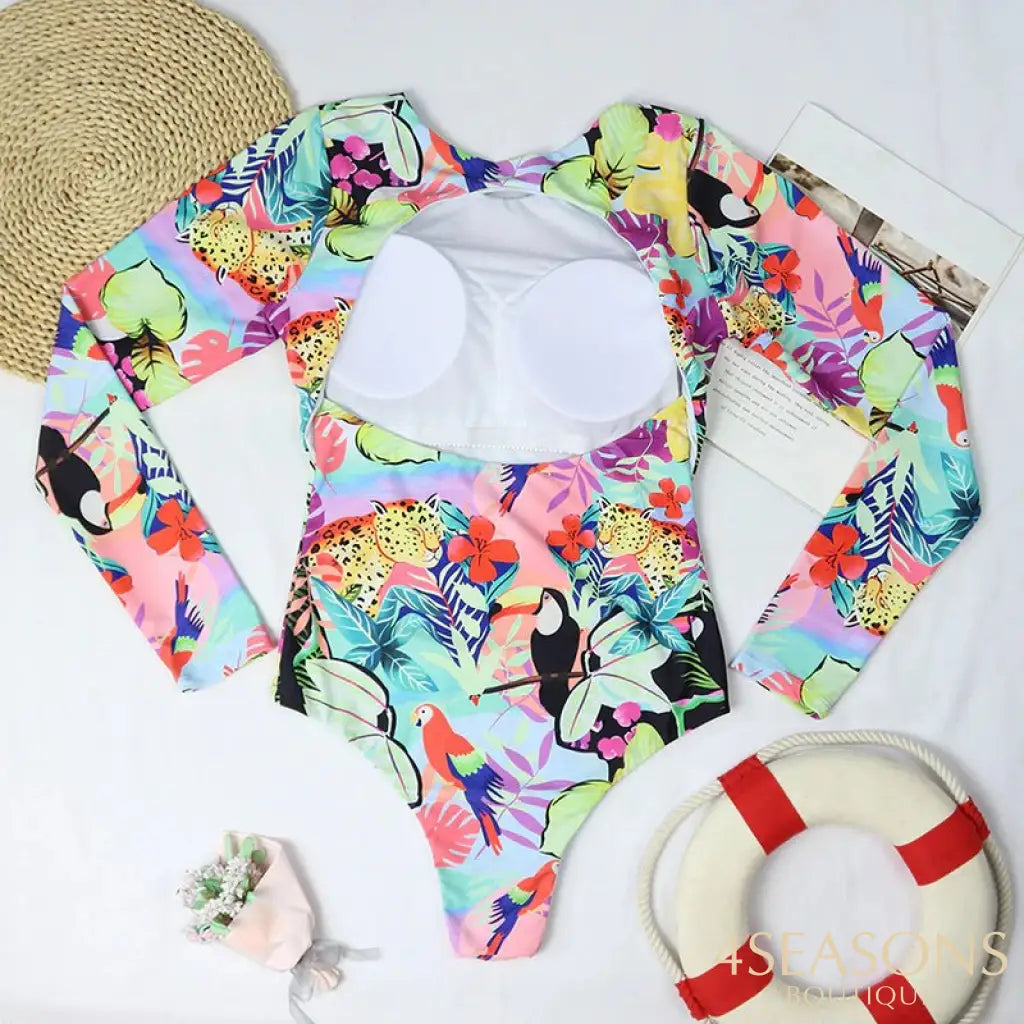 Maiô manga longa, em várias estampas com gola frontal, zíper e/ou amarração. Possui bojo removível. Calcinha tamanho tradicional.