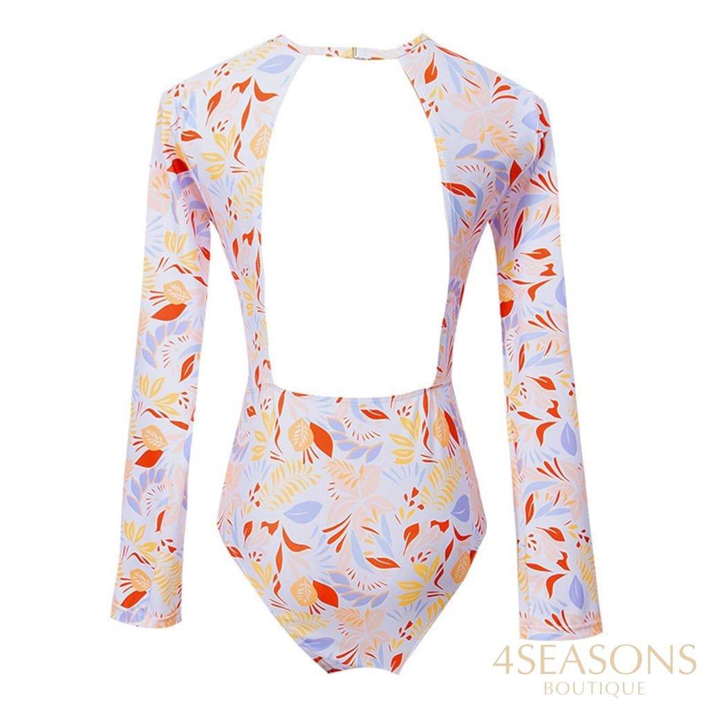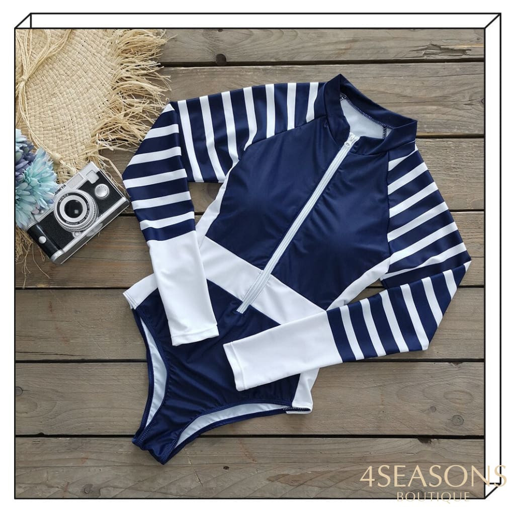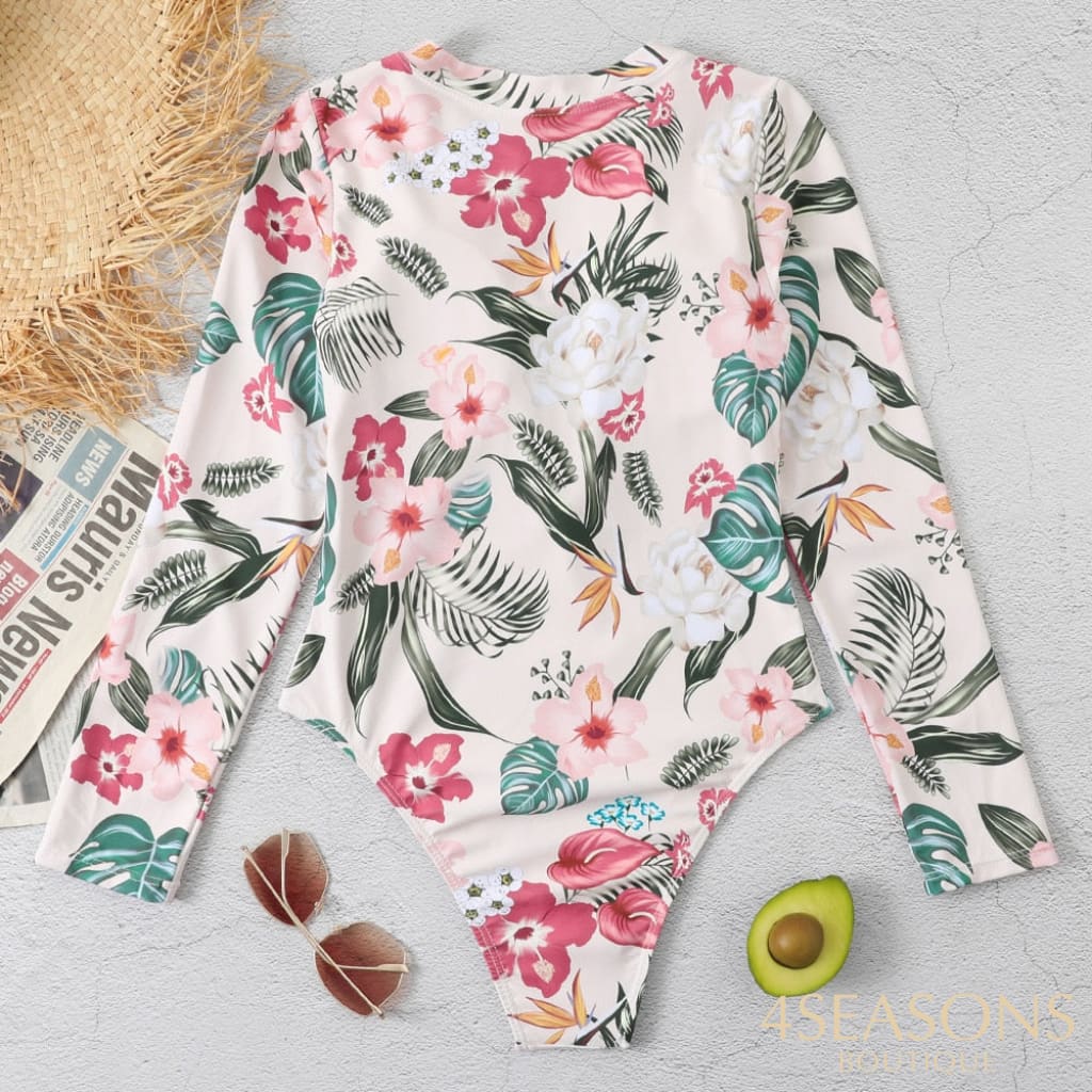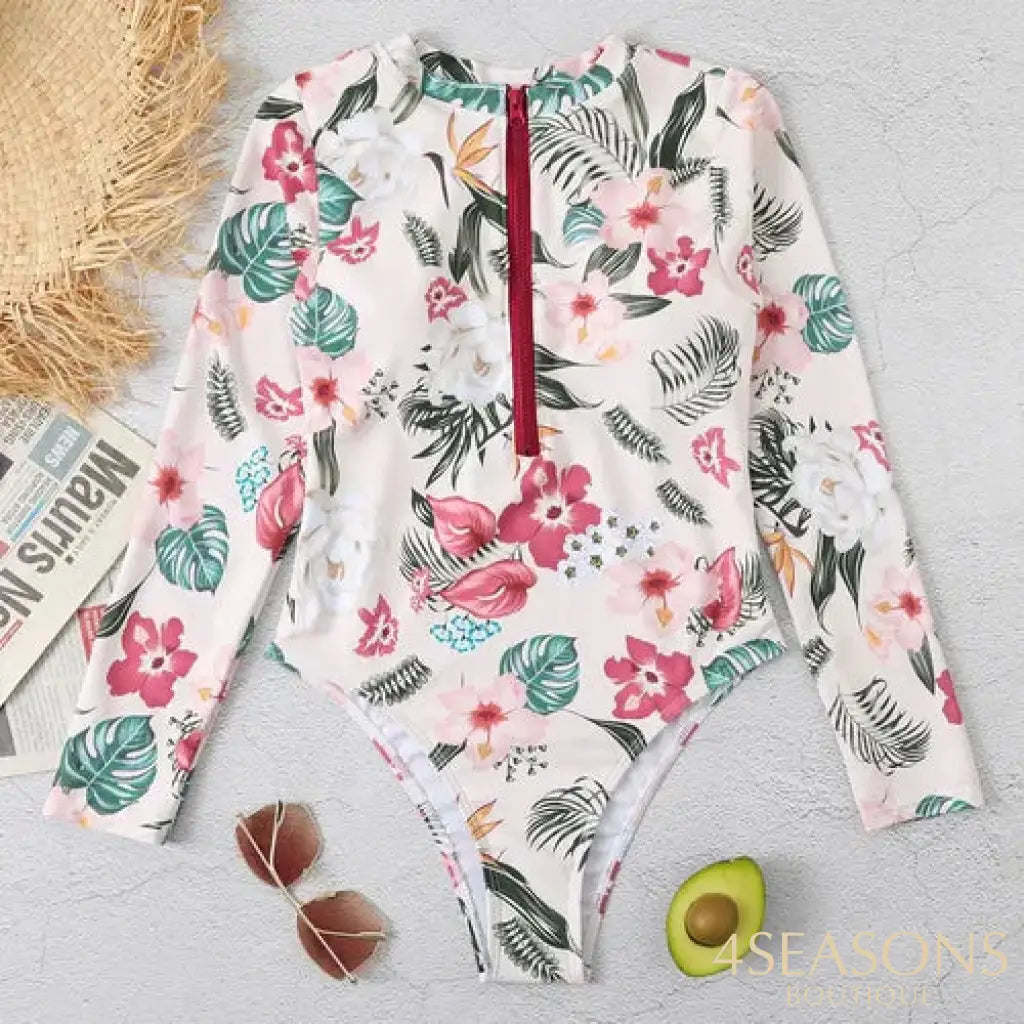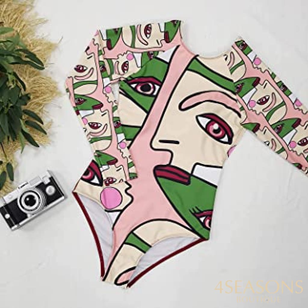 Maiô manga longa, em várias estampas com gola frontal, zíper e/ou amarração. Possui bojo removível. Calcinha tamanho tradicional.