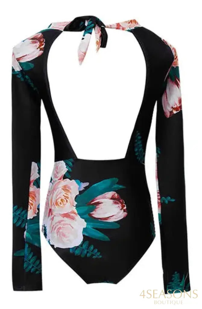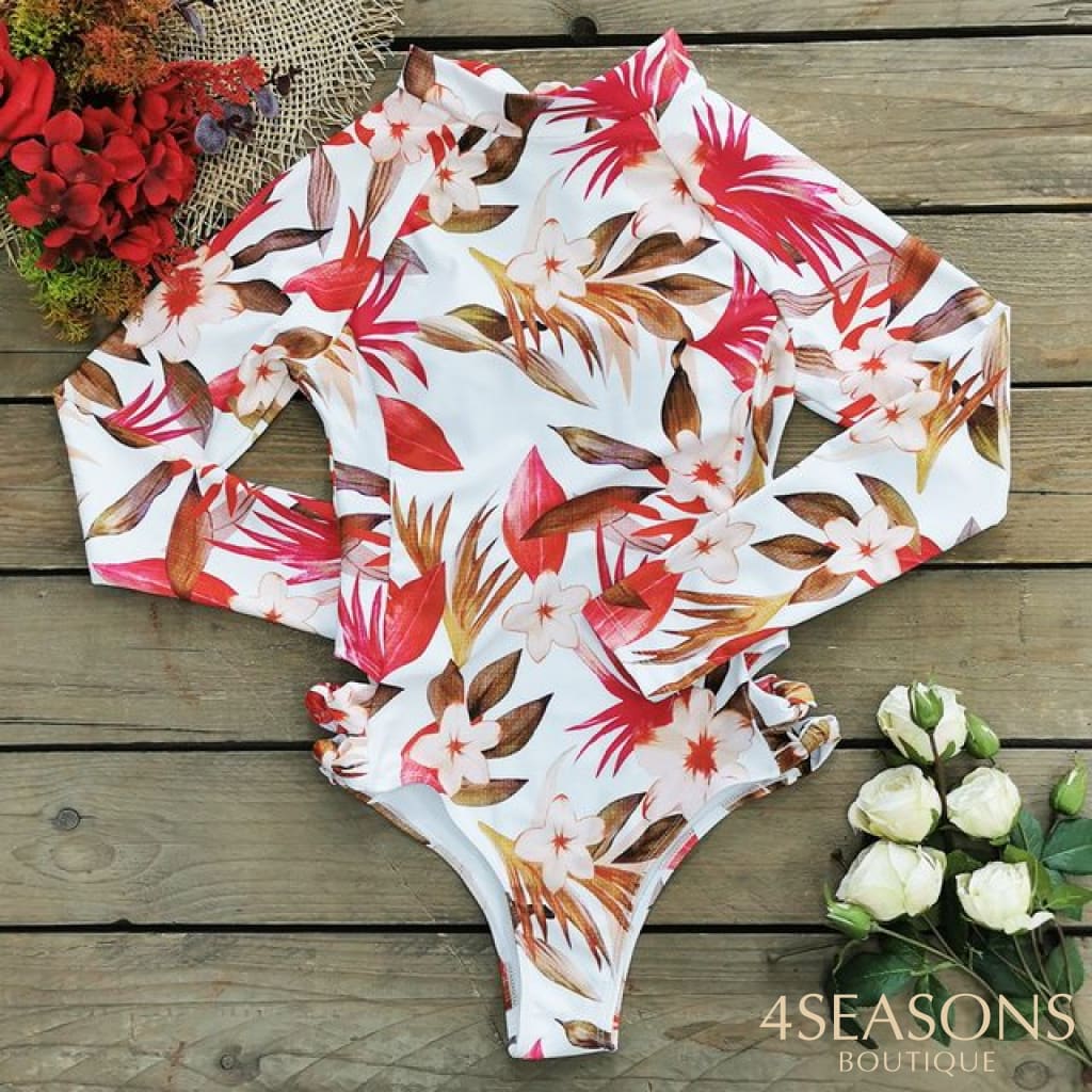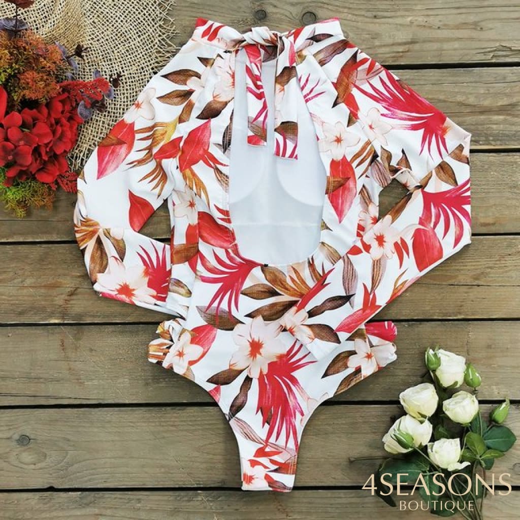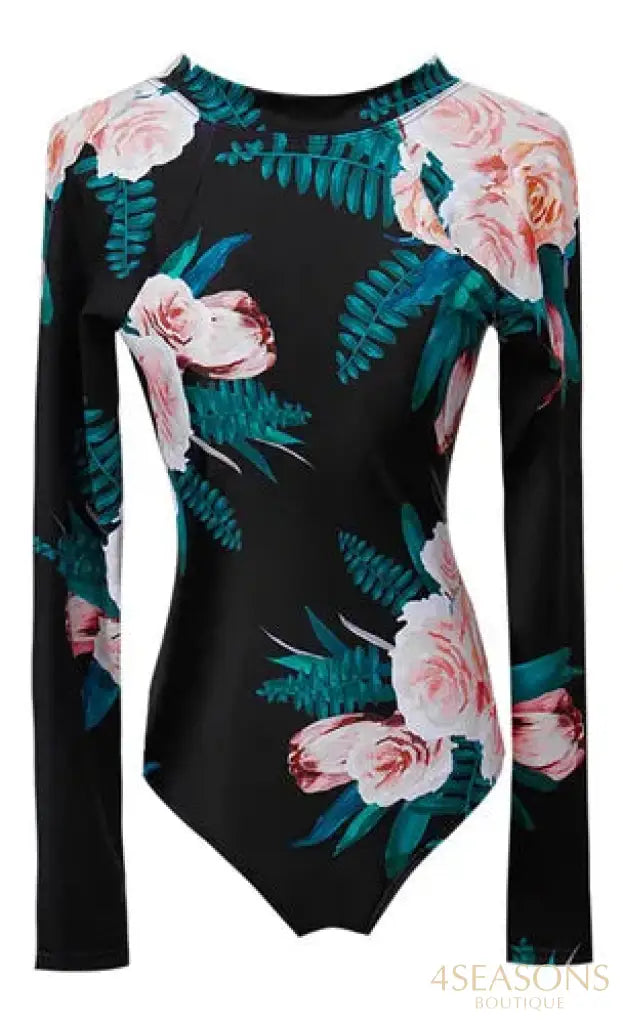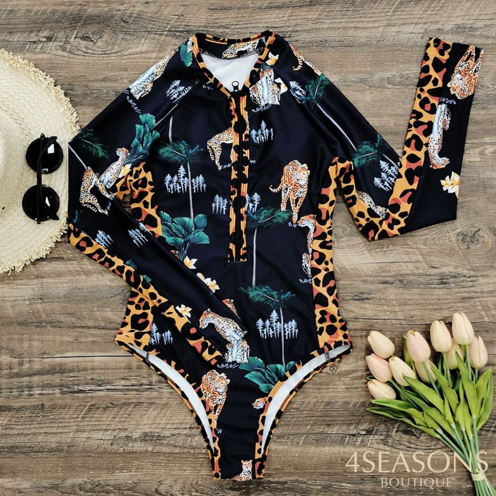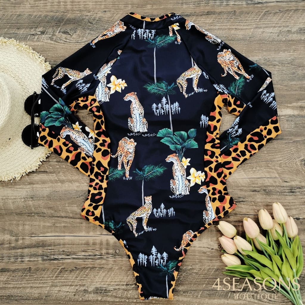 Maiô manga longa, em várias estampas com gola frontal, zíper e/ou amarração. Possui bojo removível. Calcinha tamanho tradicional.