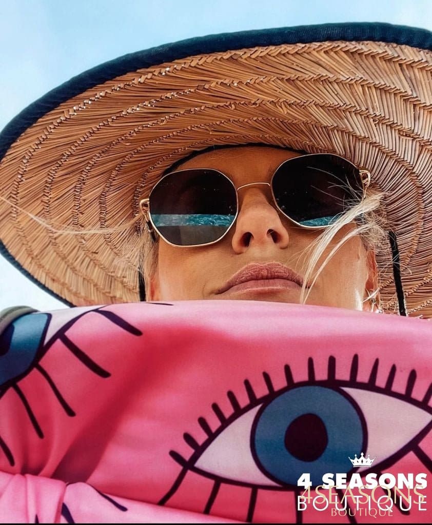 Saída de Praia longa, com detalhe de olho grego, disponível na cor rosa, branco e azul. Confeccionada com poliéster.