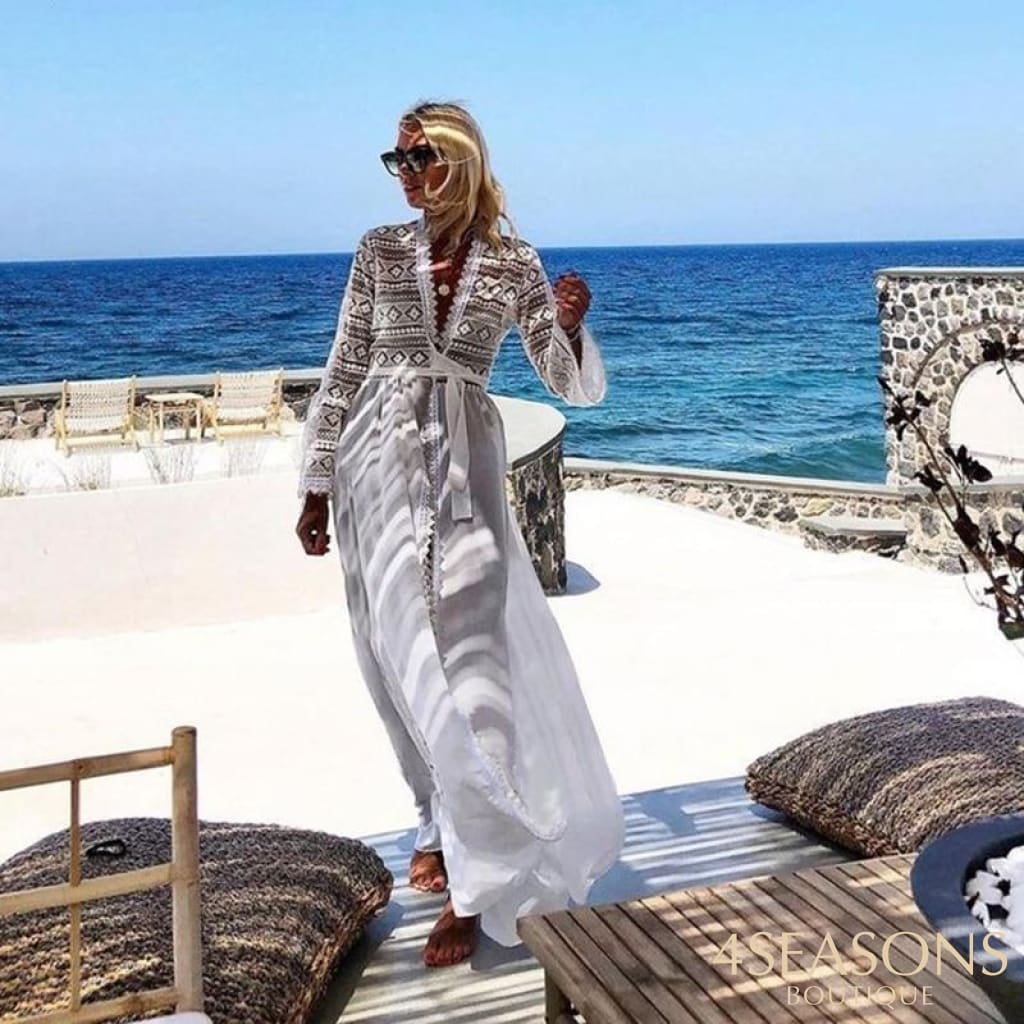Saída de Praia disponível em branco. Decote v e renda. Amarração na cintura conforme a modelagem proporcionando acinturamento.