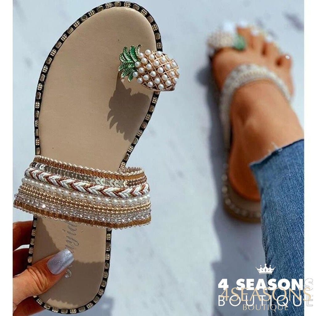 Chinelo de dedo feita com couro ecológico e solado de borracha com pingente de abacaxi e bordado em missangas. Modelo versátil, pois pode ser utilizado com looks praianos, sendo muito leve e arejado, proporcionando conforto e versatilidade ao seu usuário. Compre agora o seu e descubra todo o poder que este acessório de moda incrível pode dar ao seu estilo!