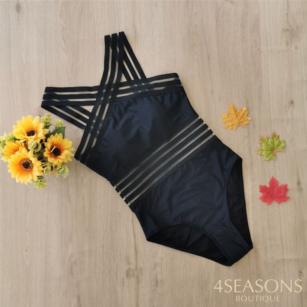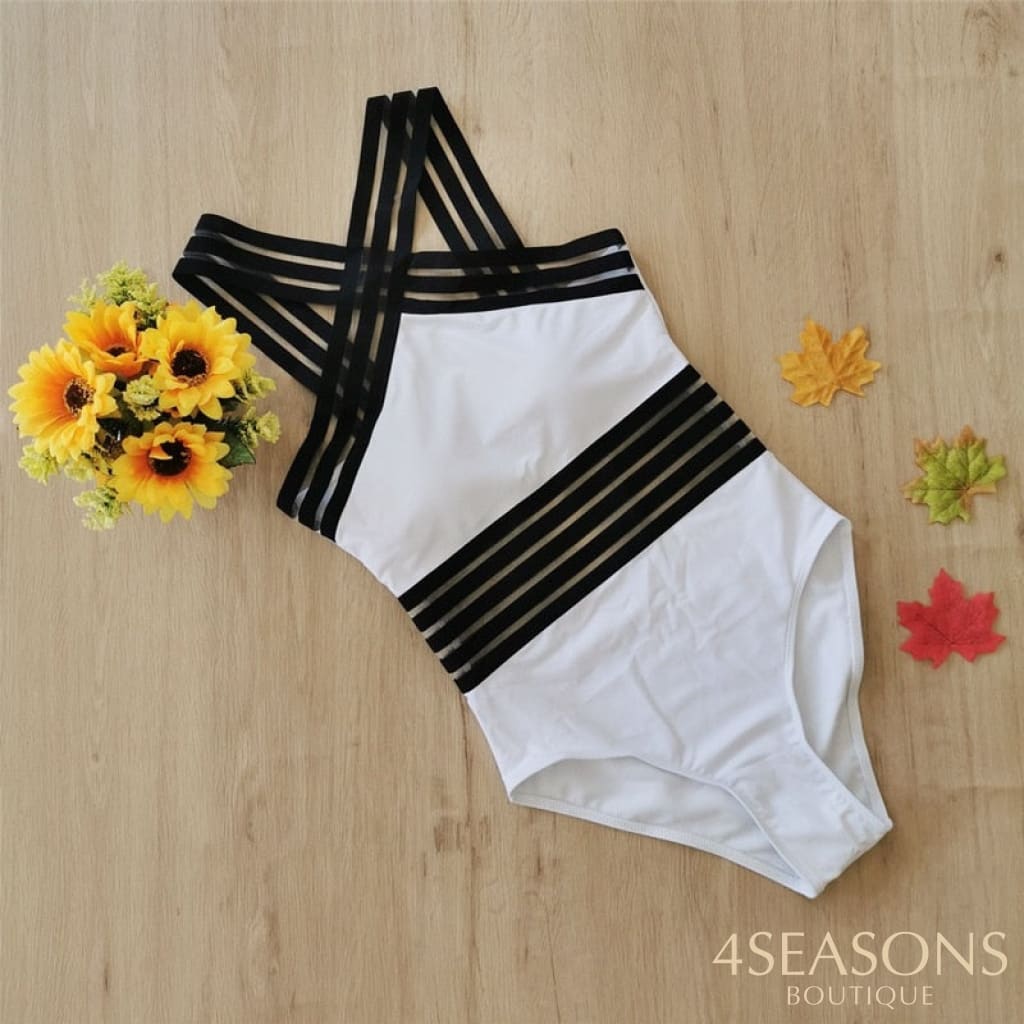 Maiô com alça frontal cruzada disponível em preto, branco com preto, branco com bege dourado e vermelho;