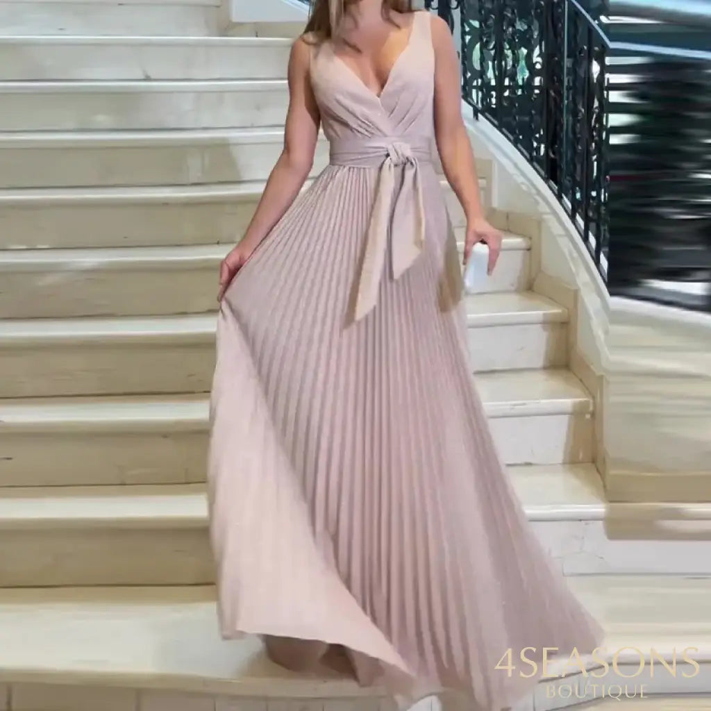 - Estilo do vestido : Plissado longo com leve calda e amarração na cintura modelando a silhueta