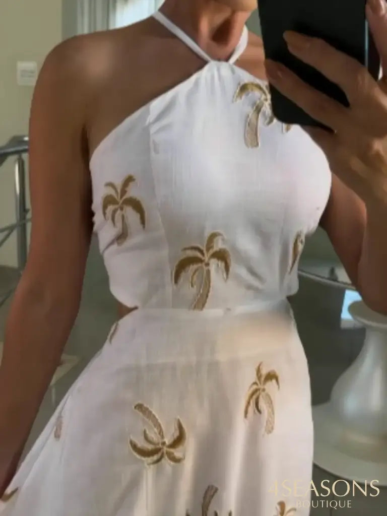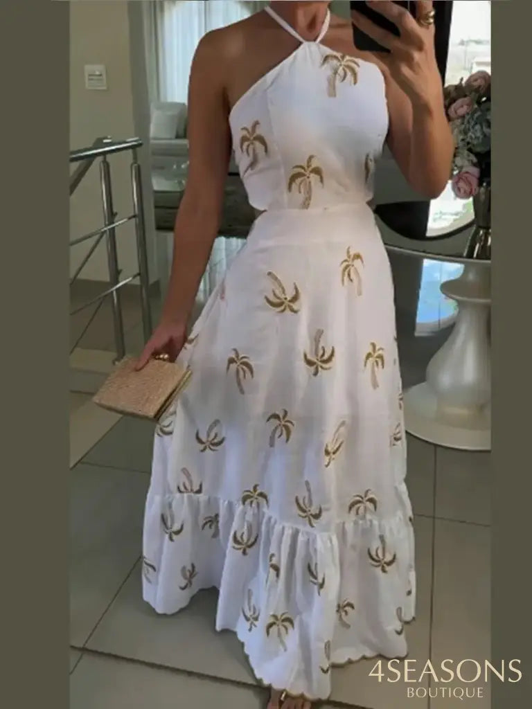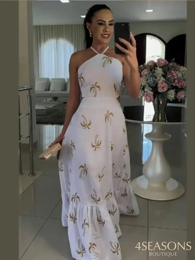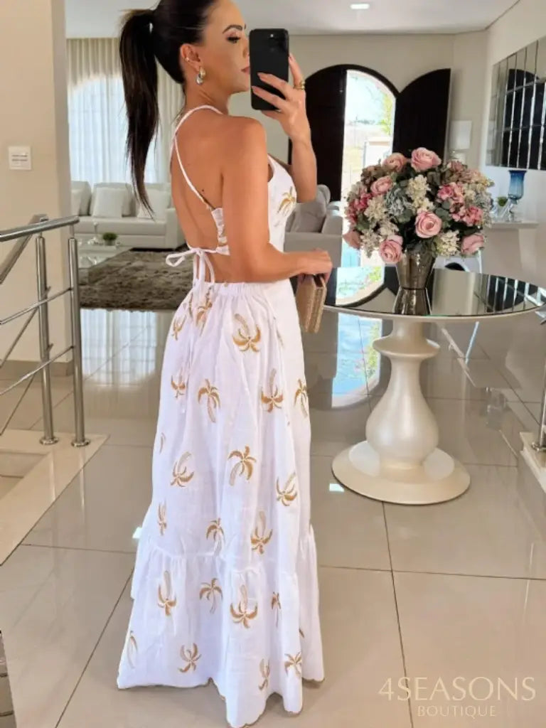 Vestido longo em camadas, pescoço cruzado e amarração nas costas