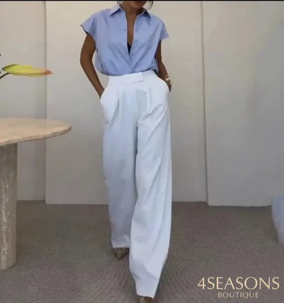 - Calça Pantalona com bolsos e detalhe de botão invisível no cós